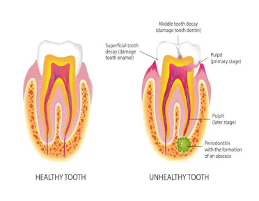 The nerve and infected pulp are removed. The inside of the tooth is cleaned, filled and sealed. Sometimes a crown is placed over the sealed tooth to make it stronger.